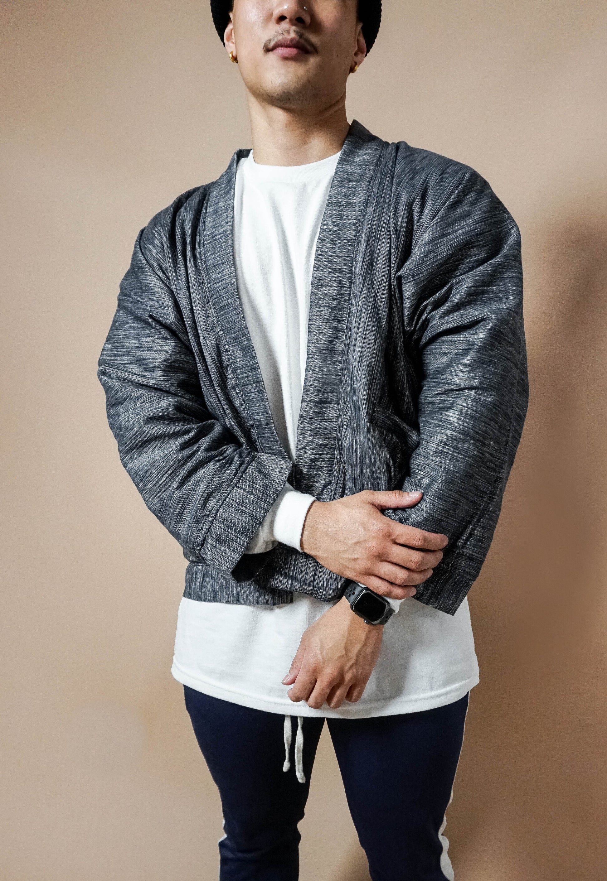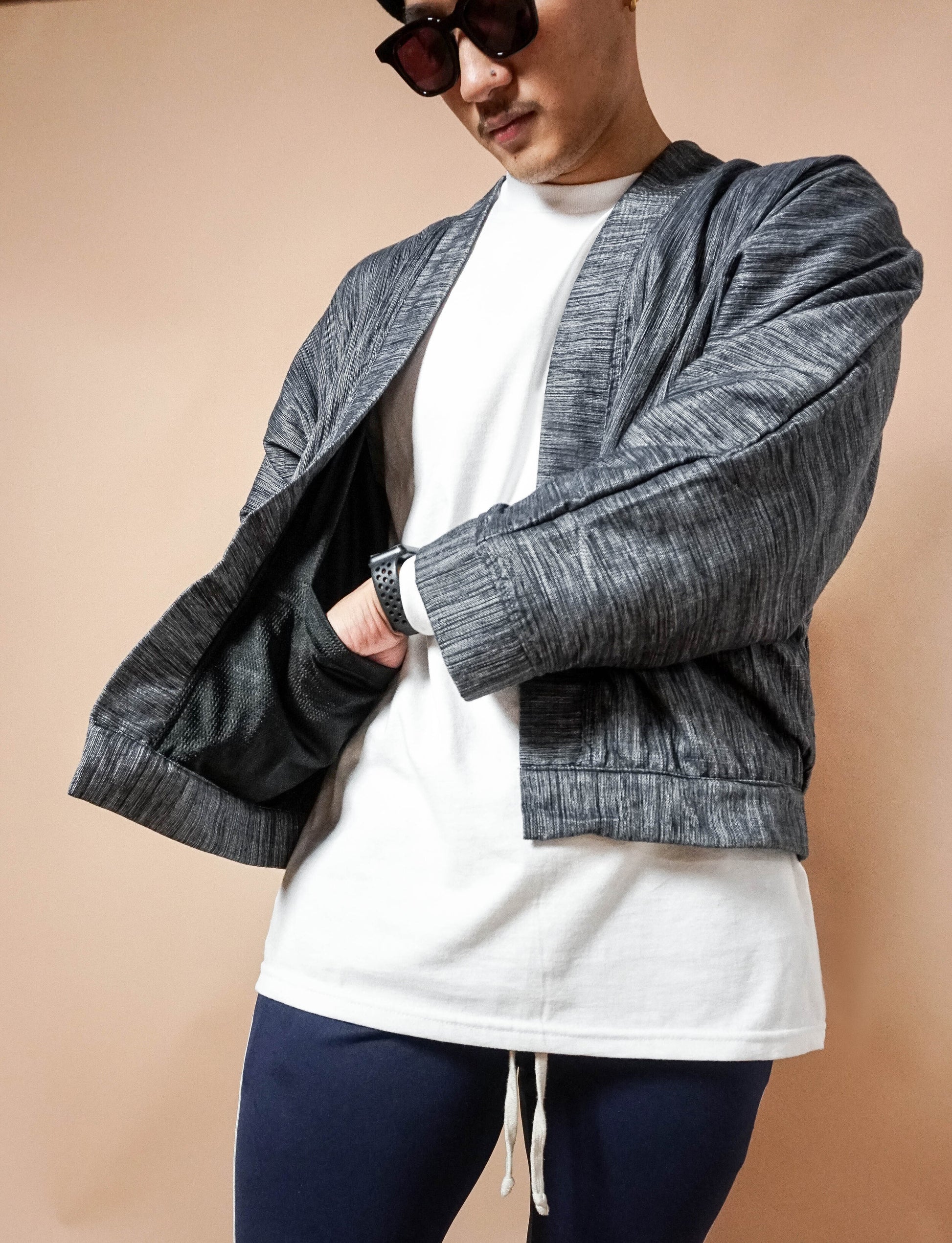 The Kimono Bomber is a hybrid of the classic bomber jacket and traditional Japanese kimono, crafted with handwoven fabric by the Itneg, Inlaud Tribe of Abra in the Cordillera Region, and finished with a breathable mesh lining. It features two 7” interior pockets and two 7” exterior pockets for practicality and style.