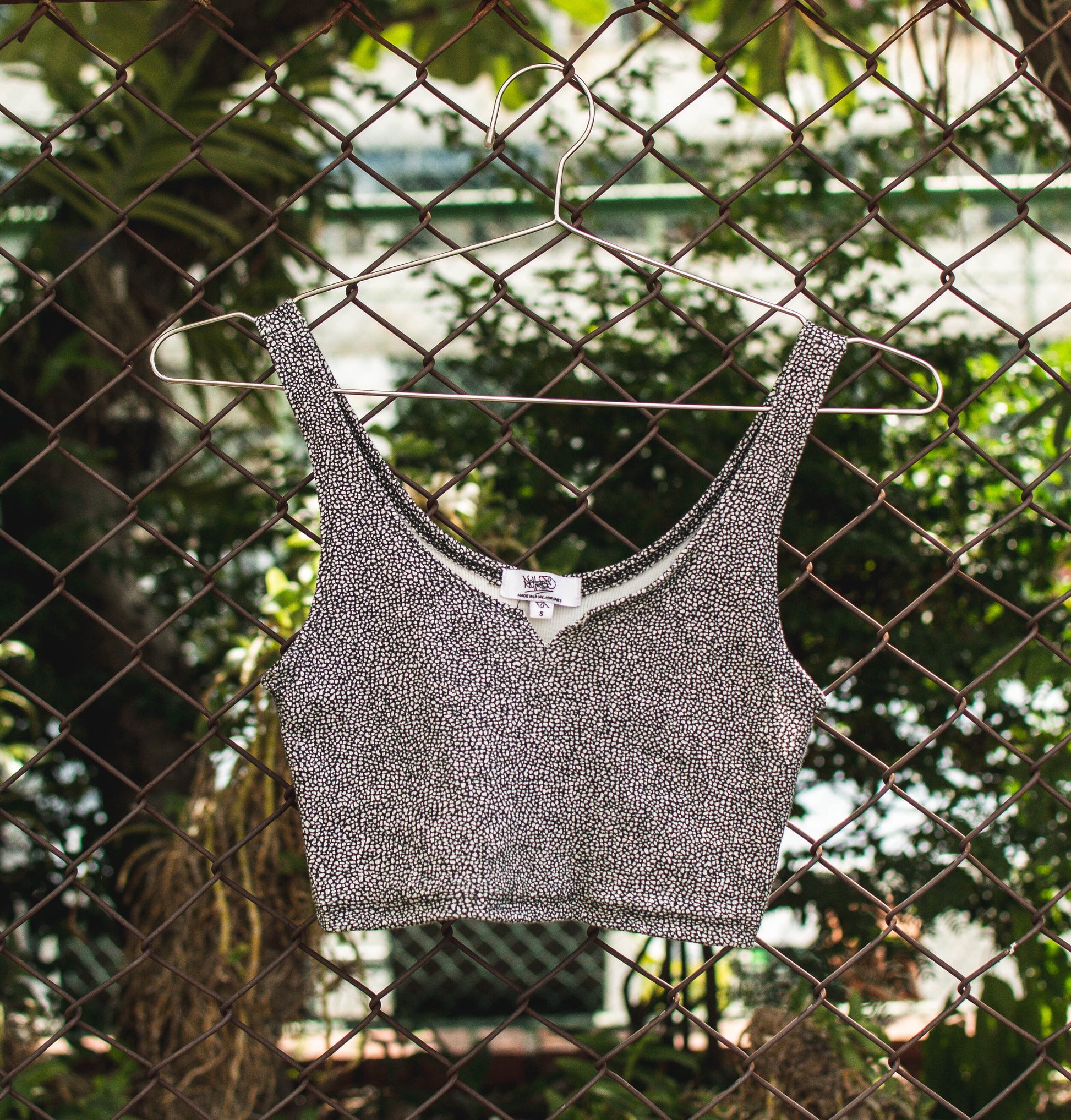 Minimal yet striking, the notched tank top features a subtle V-shaped cut at the neckline, adding a touch of architectural detail to a classic crop silhouette. Crafted for effortless layering or standalone wear, its clean lines and relaxed fit make it a timeless wardrobe staple.